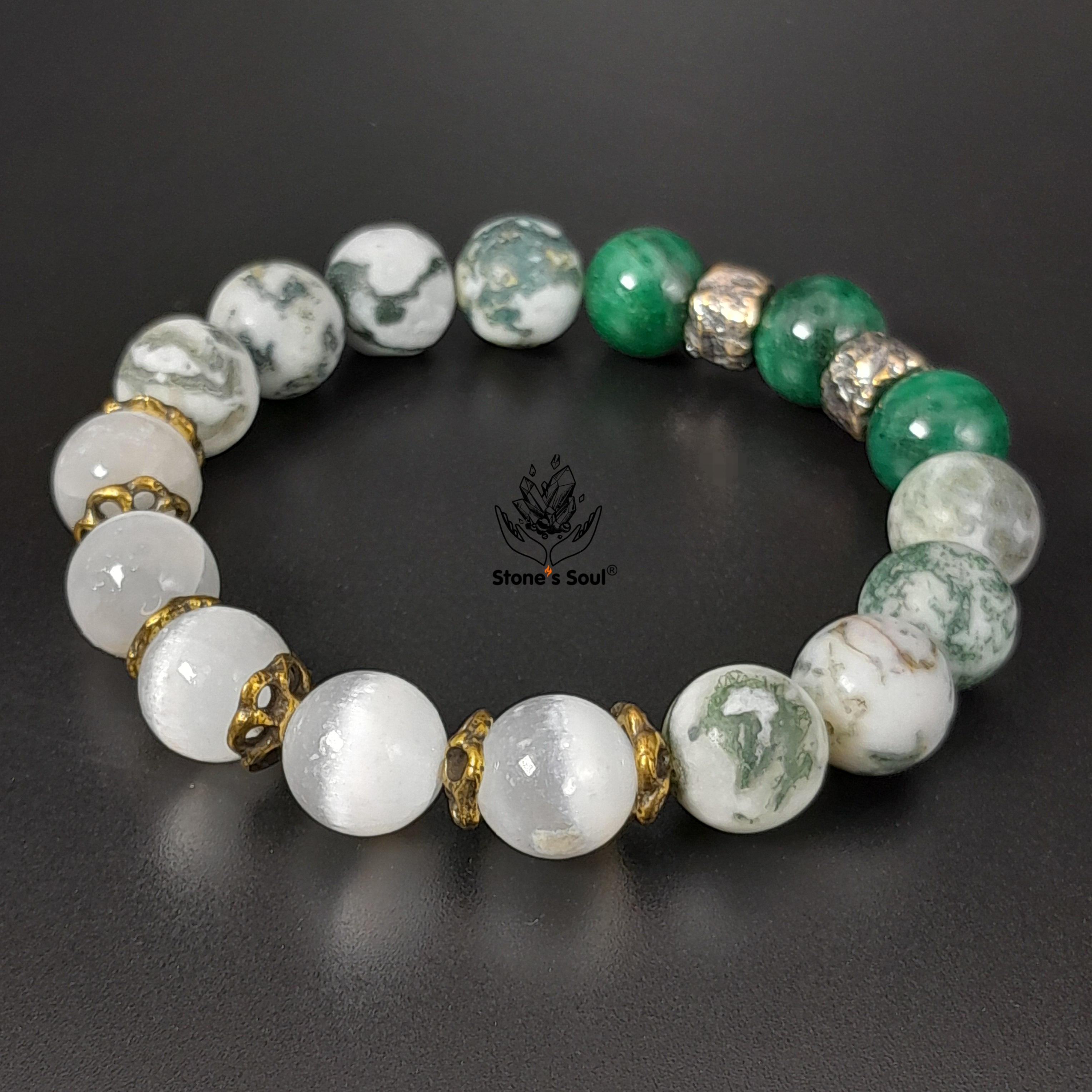 💎 Авантюрин с фукситом, Моховый агат (матовый), Селенит 📿 Бусины 10мм ⚜ Фурнитура латунь, латунь с патиной Артикул 1000134
