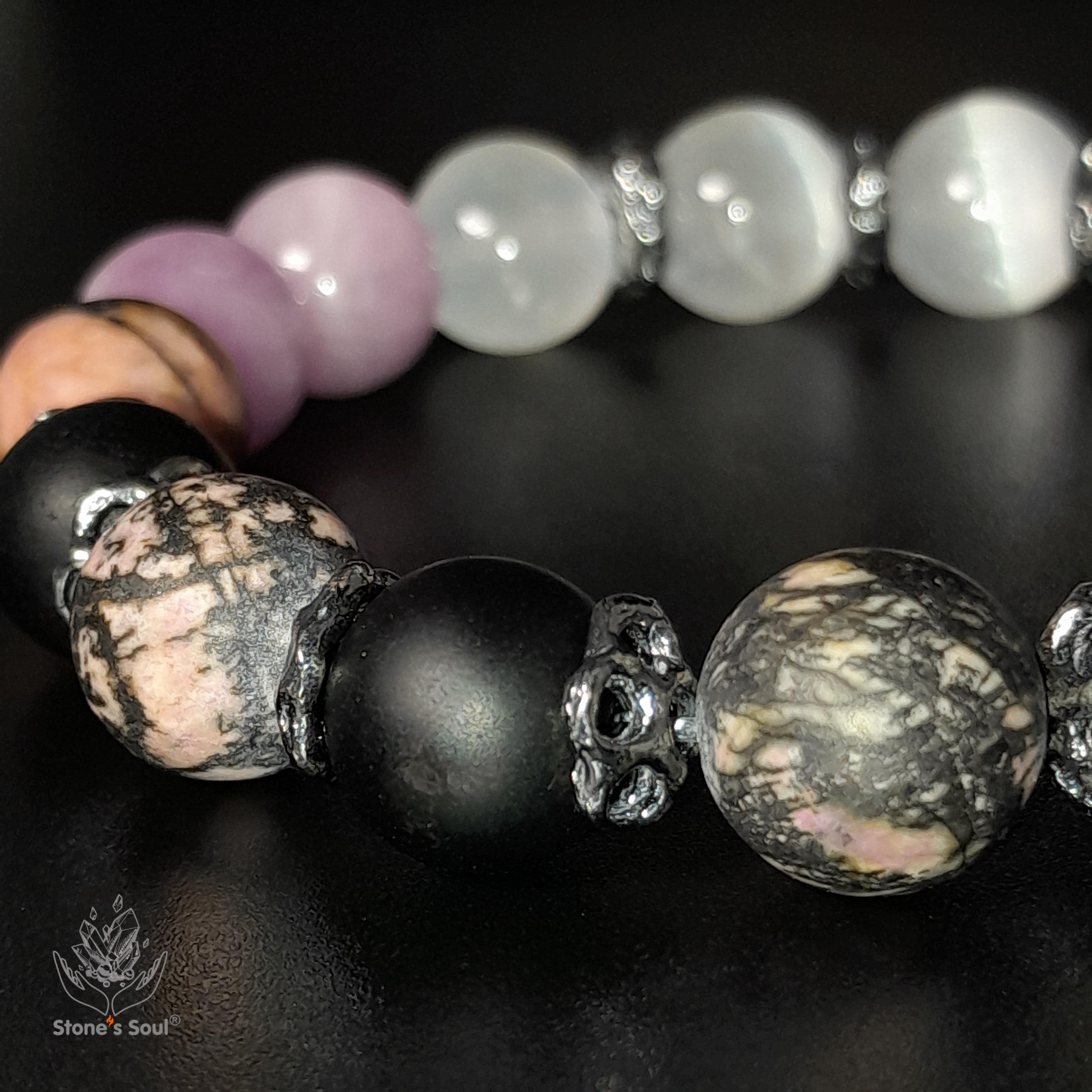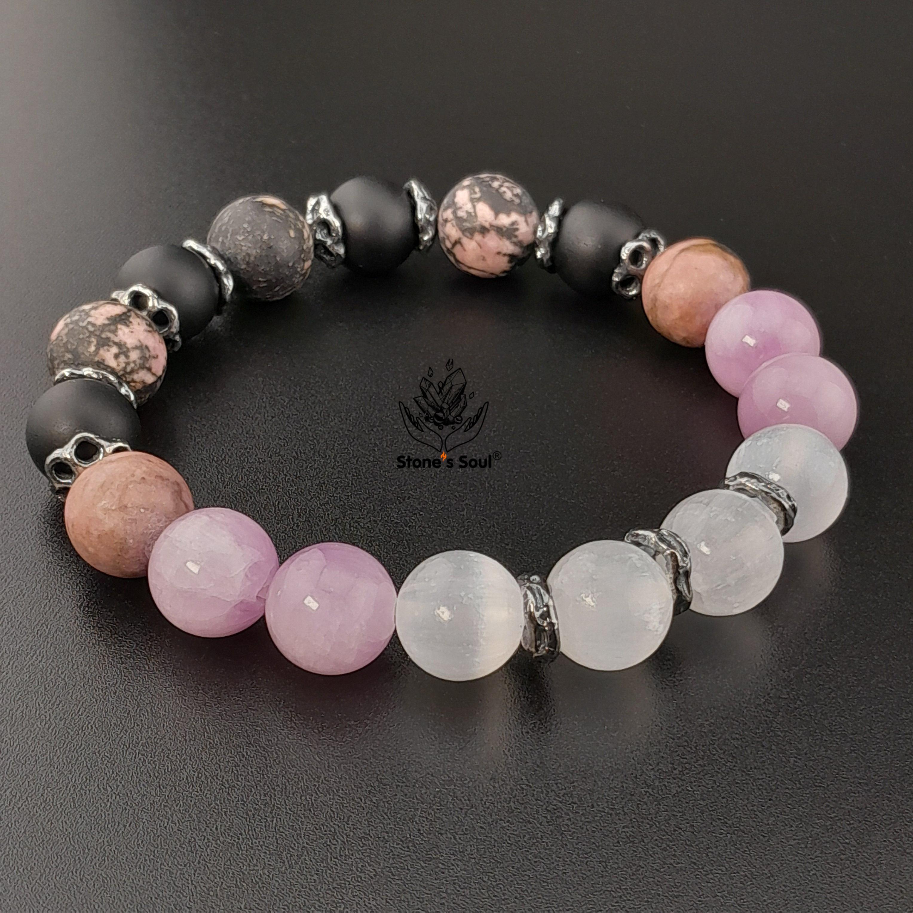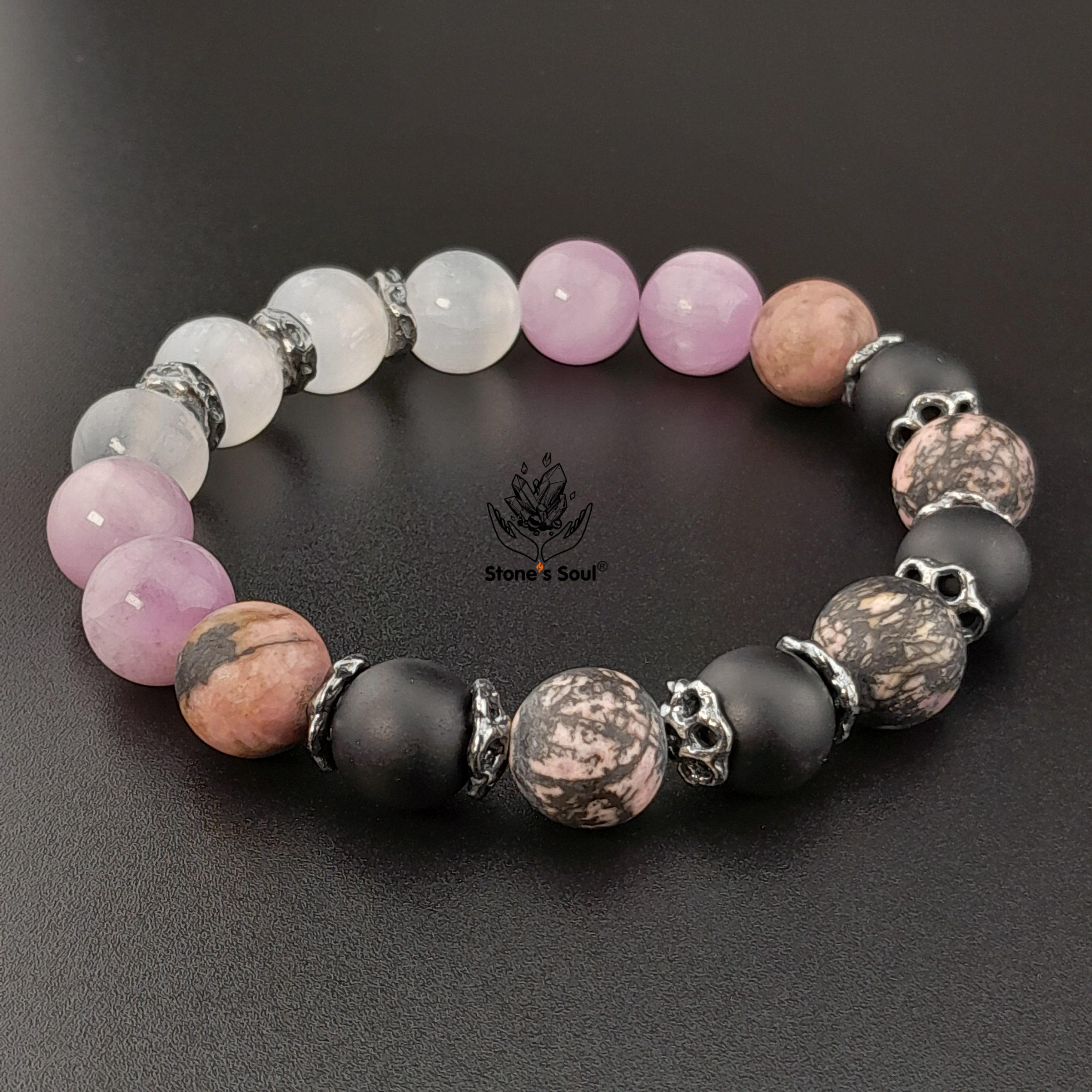 💎 Селенит, Кунцит, Родонит, Агат чёрный 📿 Бусины 10мм ⚜ Фурнитура латунь с серебрением Артикул 1000152