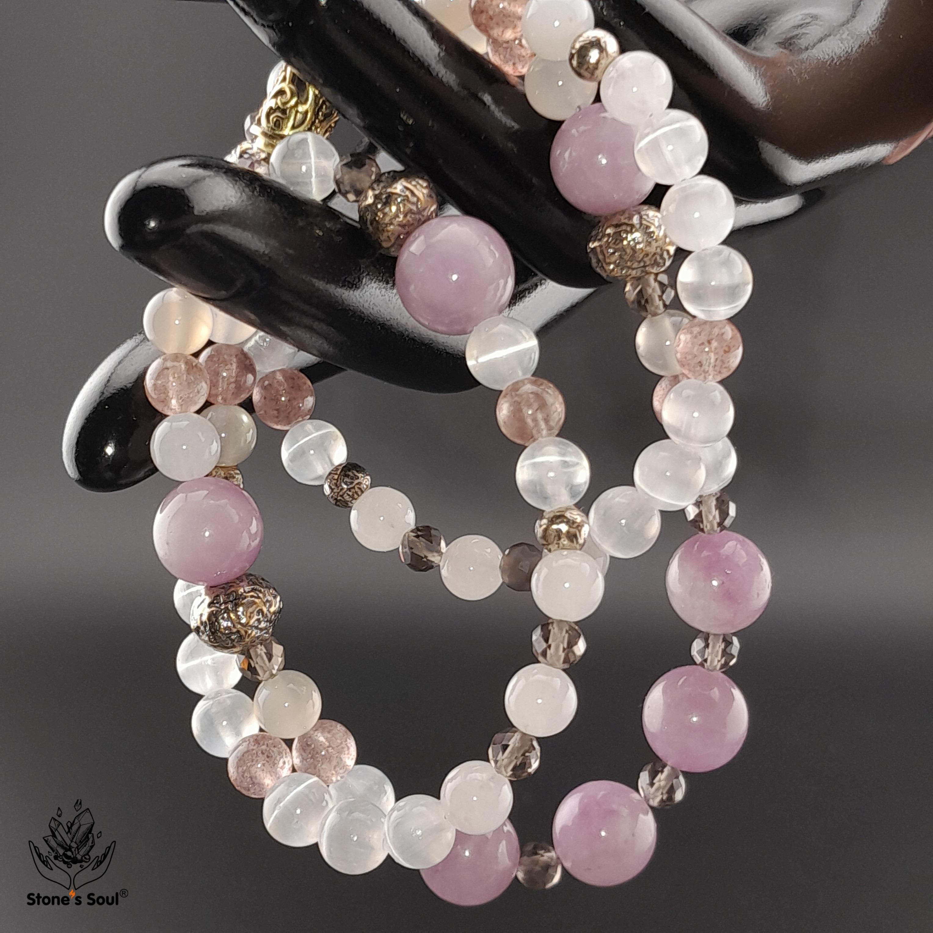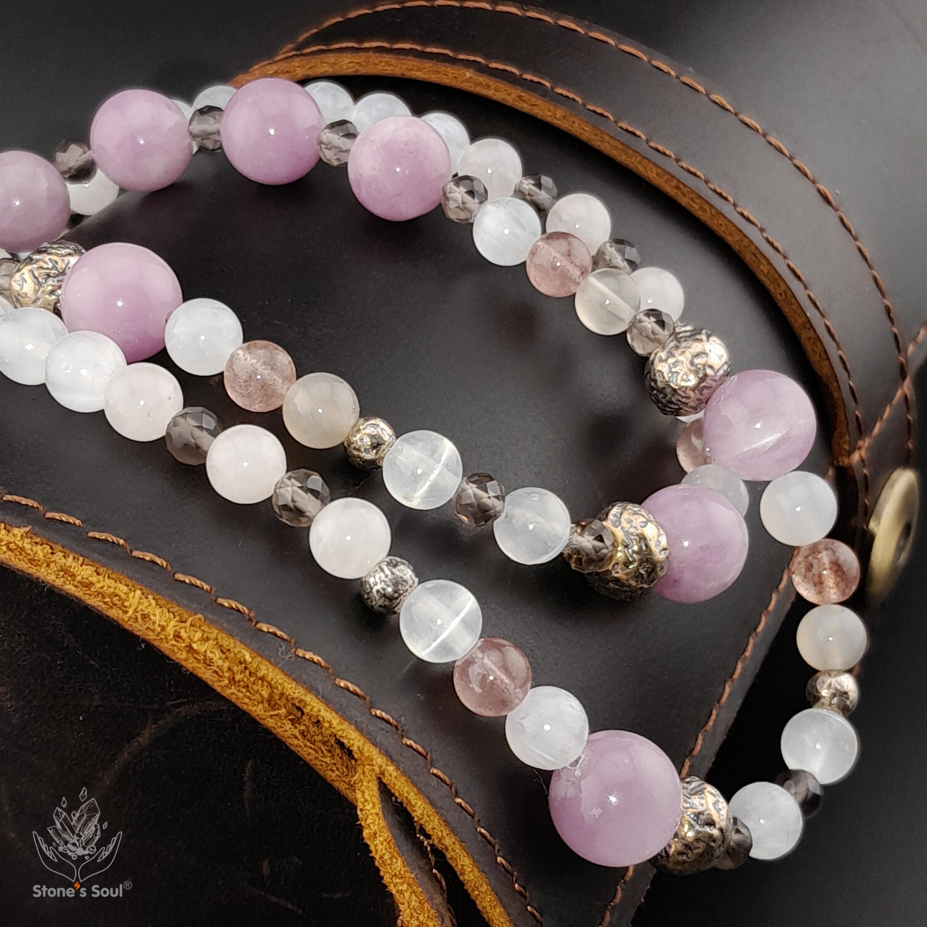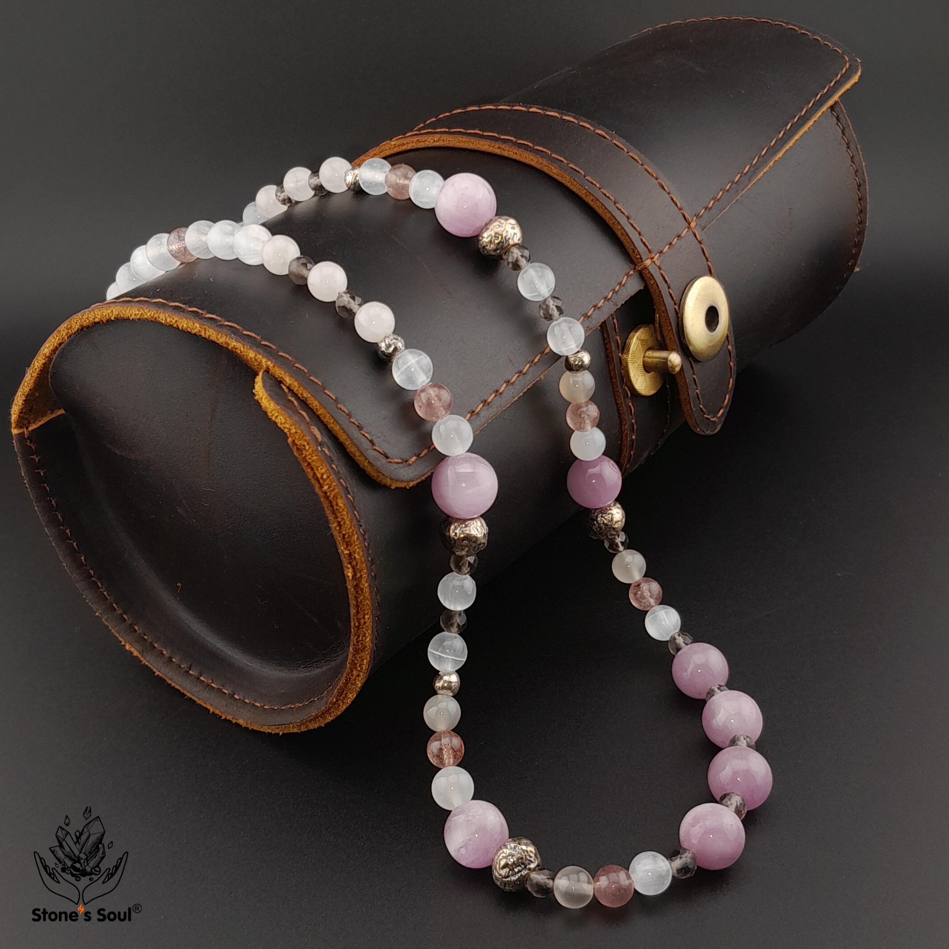 💎 Кунцит, Розовый кварц, Беломорит, Дымчатый кварц (раухтопаз), Клубничный кварц, Селенит 💫 Длина ~55см 📿 Бусины 4-10мм ⚜ Фурнитура латунь с патиной 🔒 Магнитный замок латунь 📍 Арт. 5000107