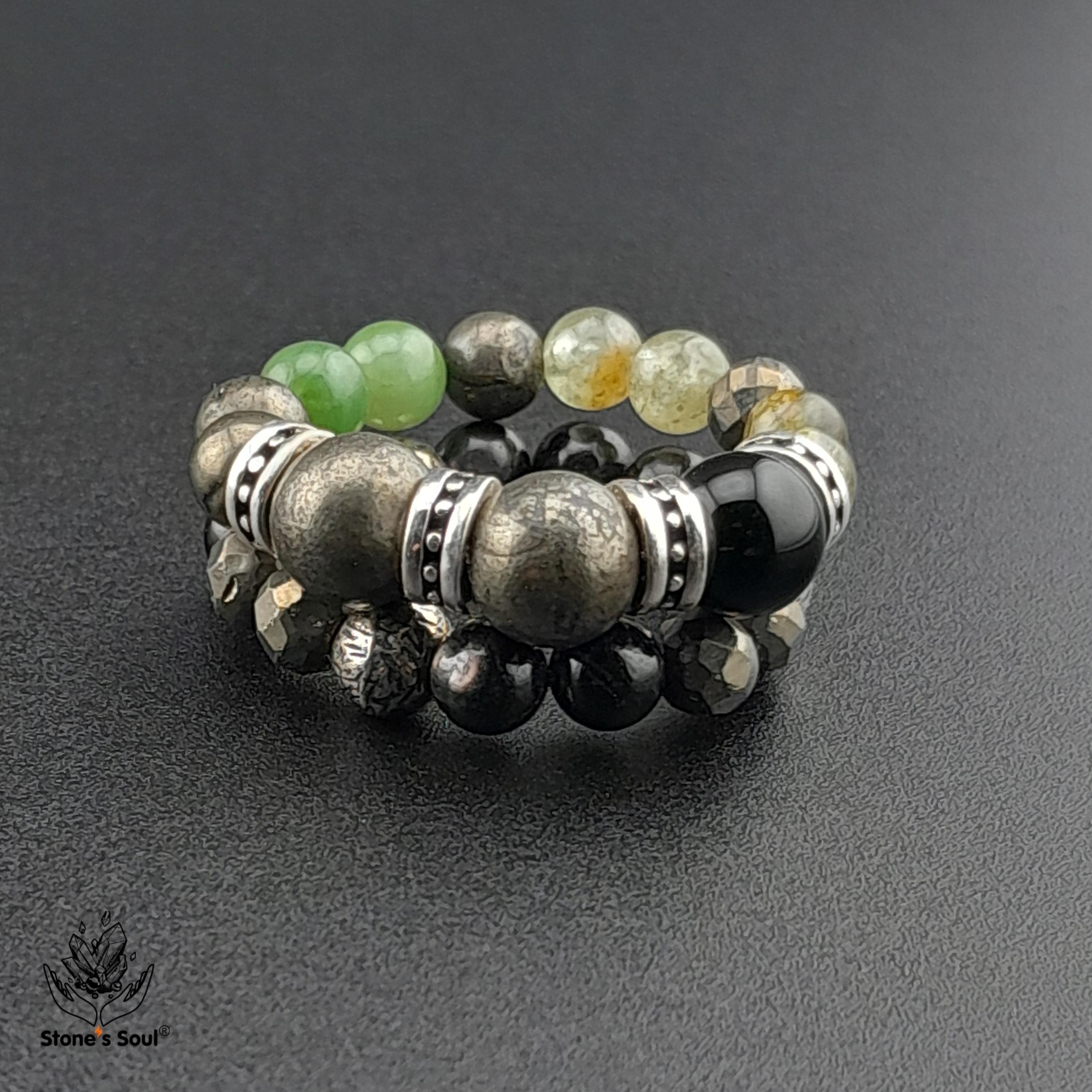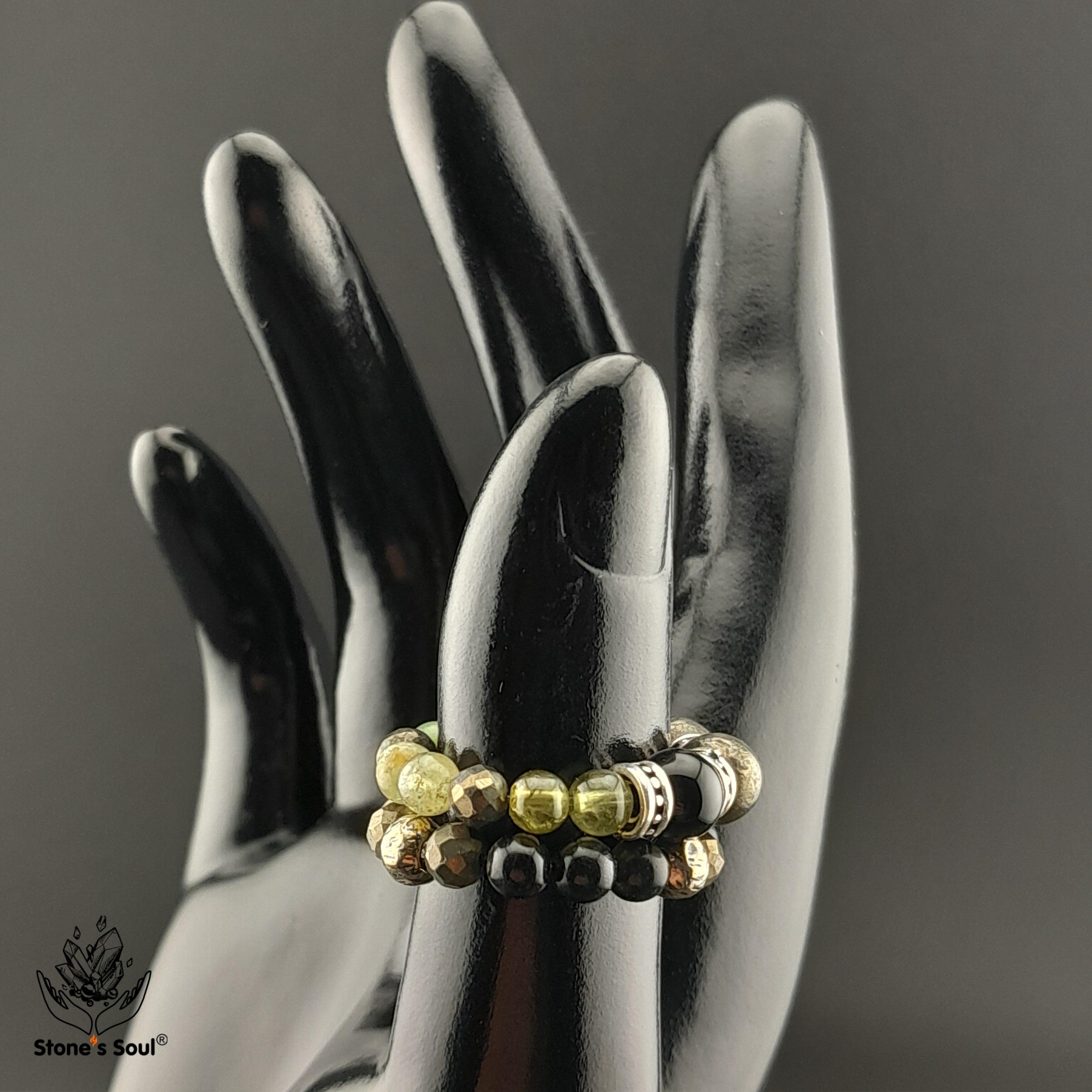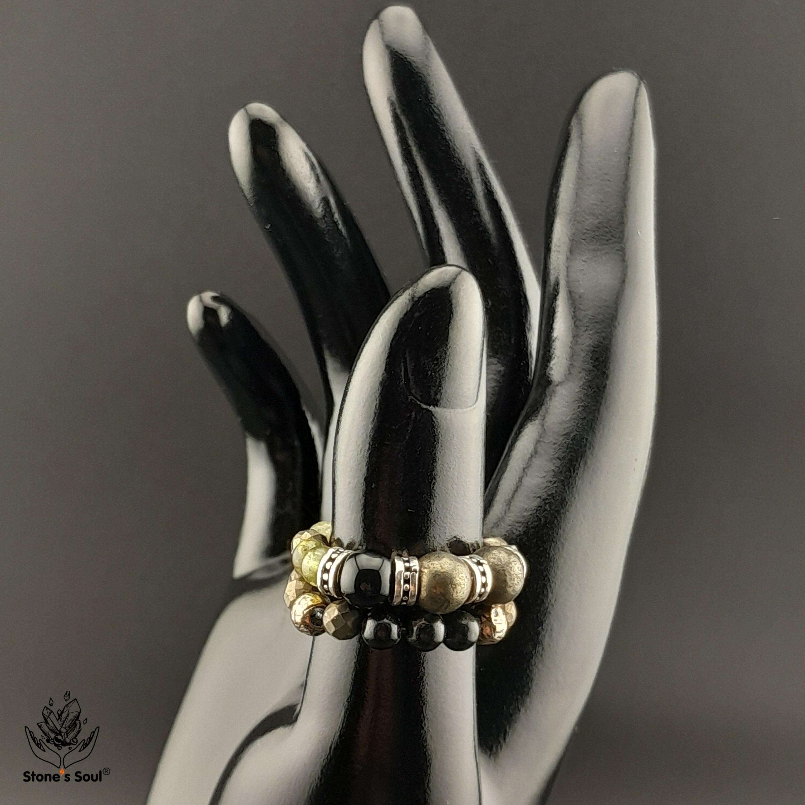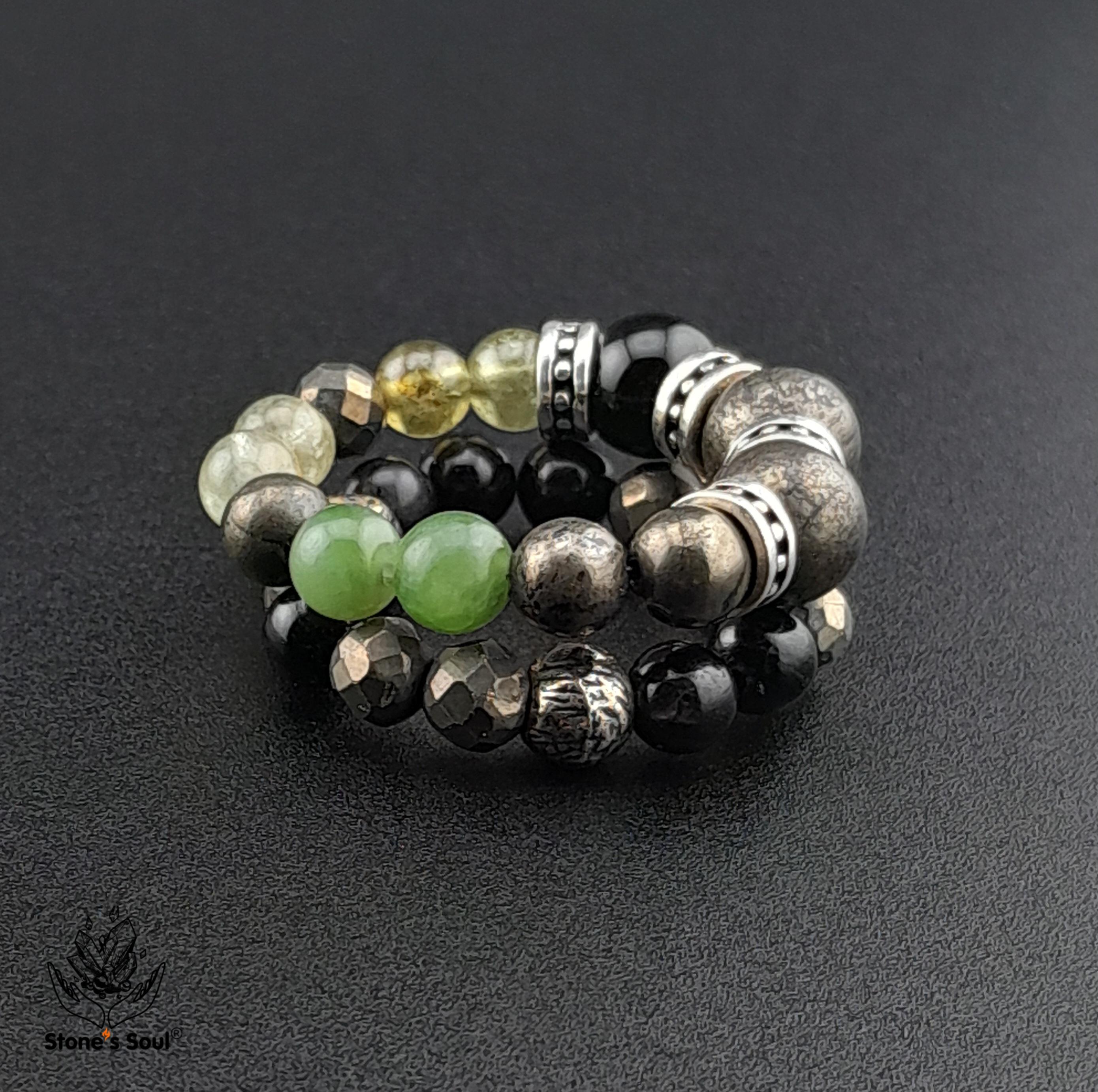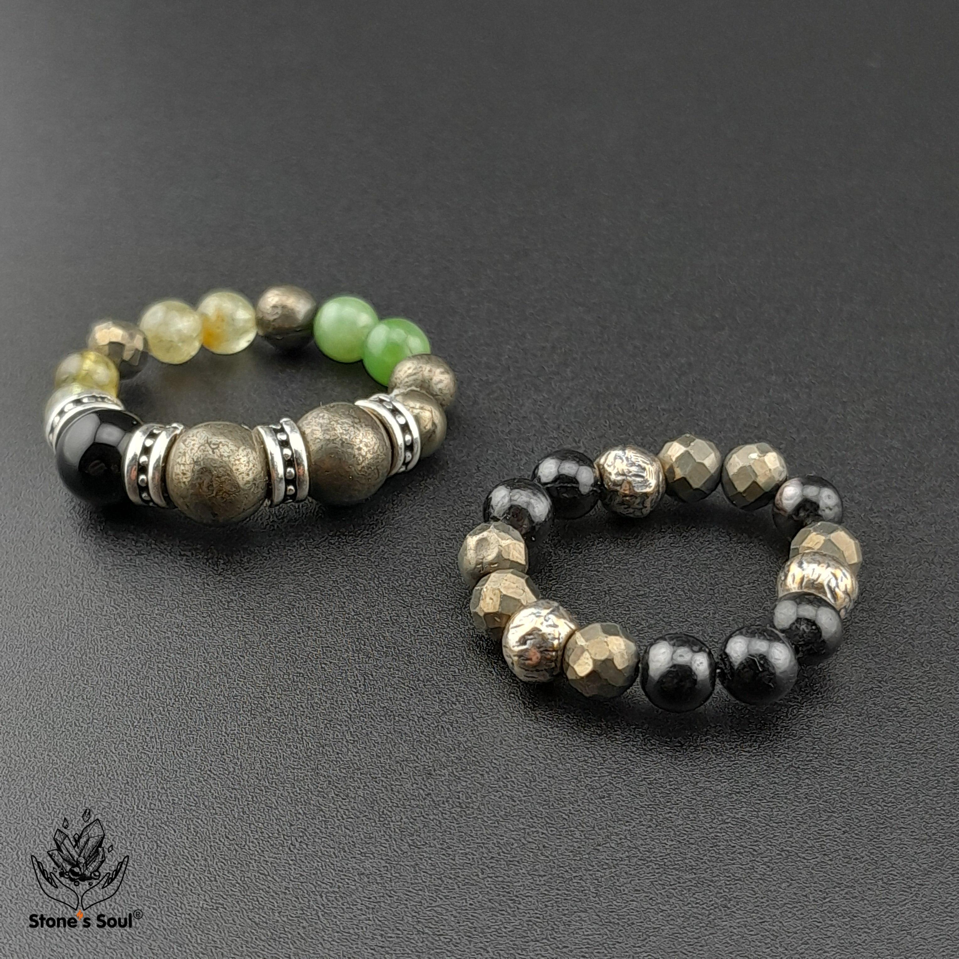 💎 Чёрный агат, Пирит, Гиперстен, Нефрит, Зелёный гранат (гроссуляр) ⚜ комплект из 2х колечек 📿 Бусины 4-6мм ⚜ Фурнитура латунь с патиной, серебро 📍 Арт. 6000102