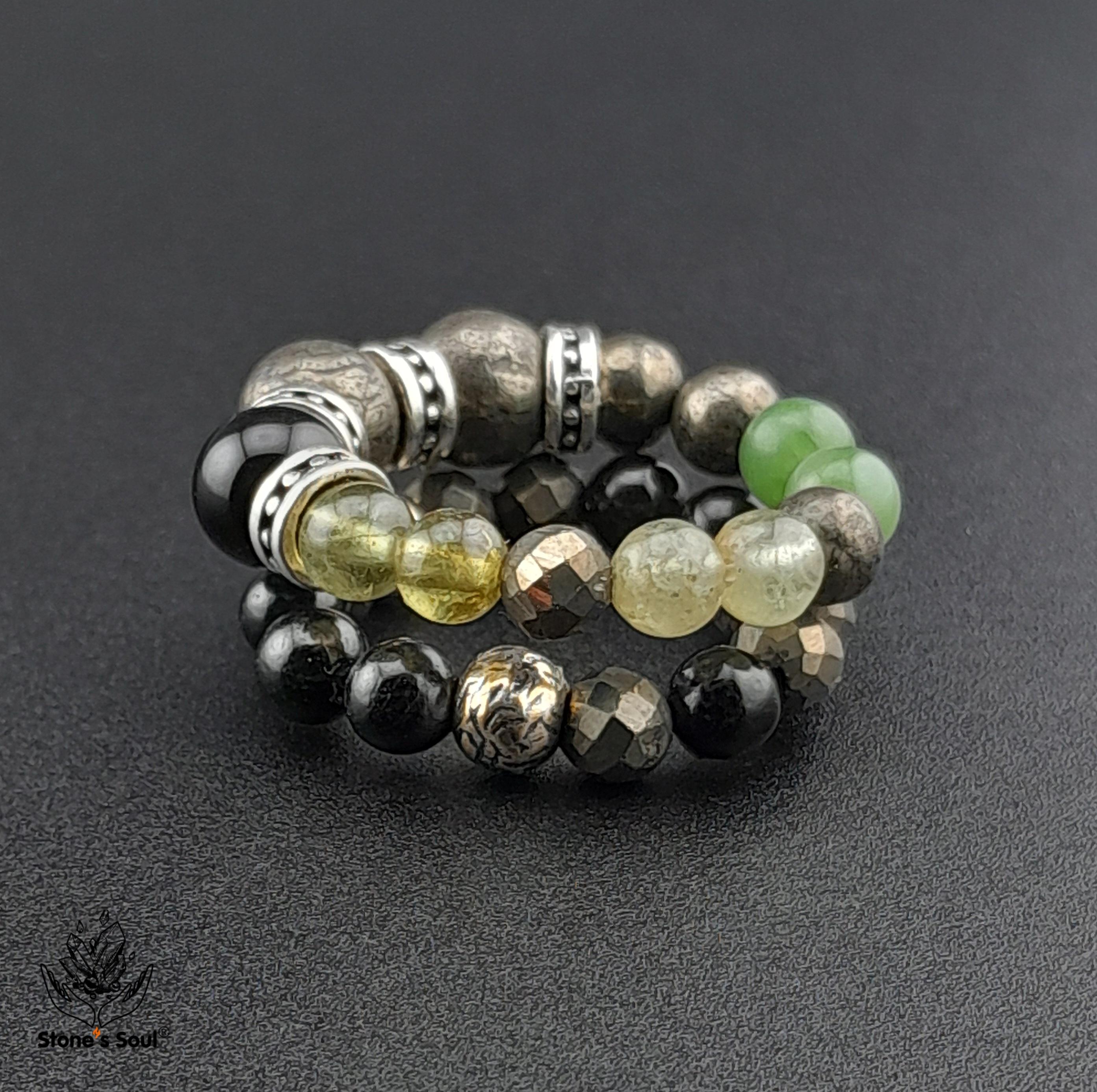💎 Чёрный агат, Пирит, Гиперстен, Нефрит, Зелёный гранат (гроссуляр) ⚜ комплект из 2х колечек 📿 Бусины 4-6мм ⚜ Фурнитура латунь с патиной, серебро 📍 Арт. 6000102
