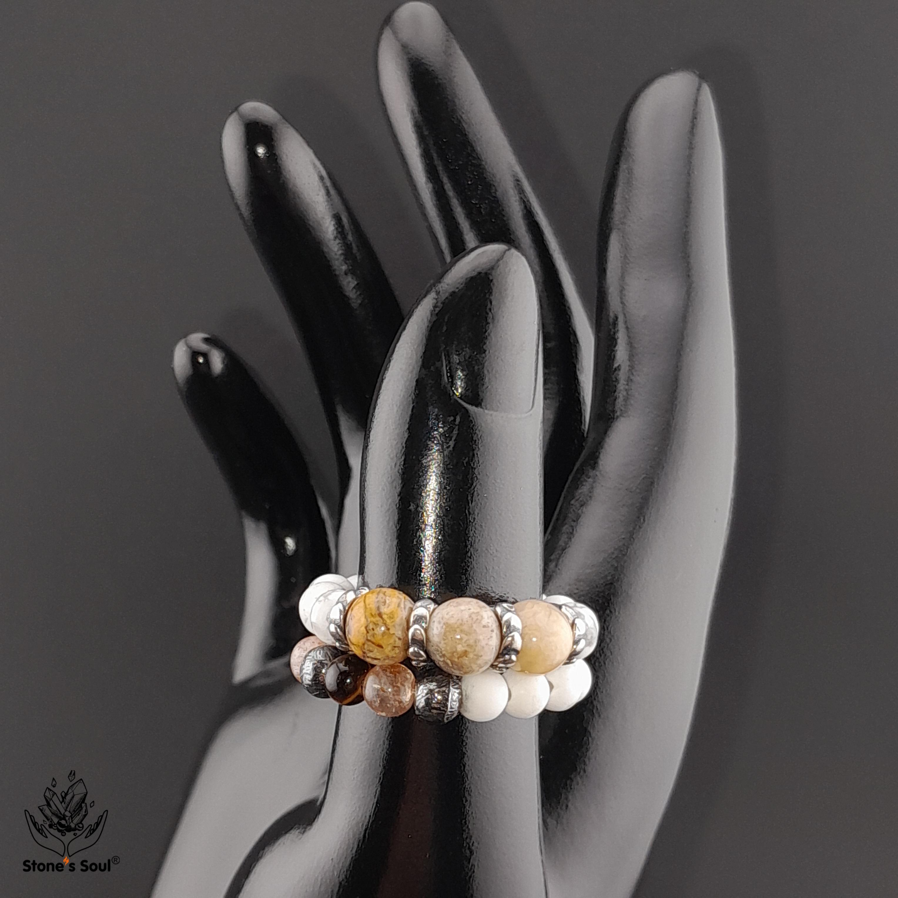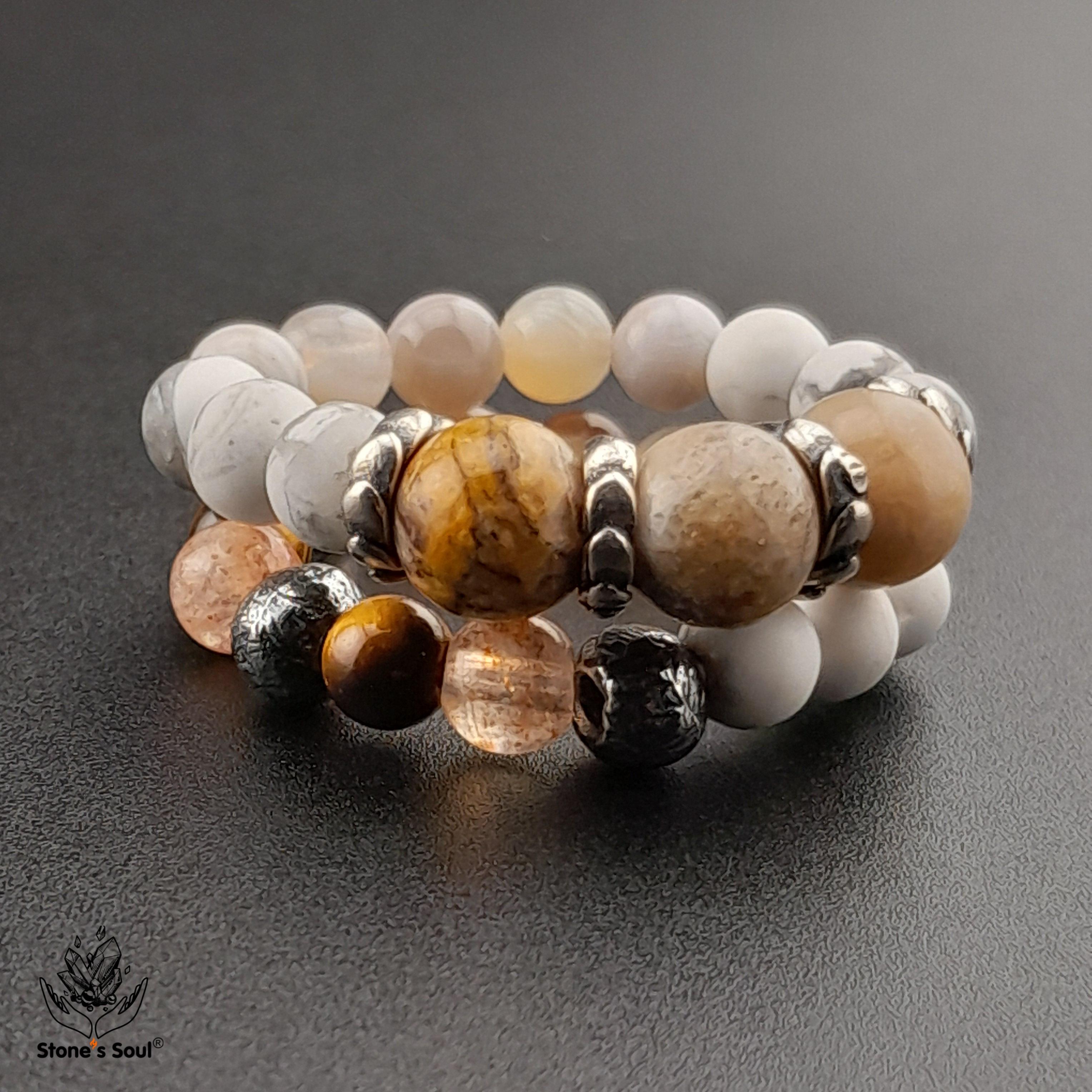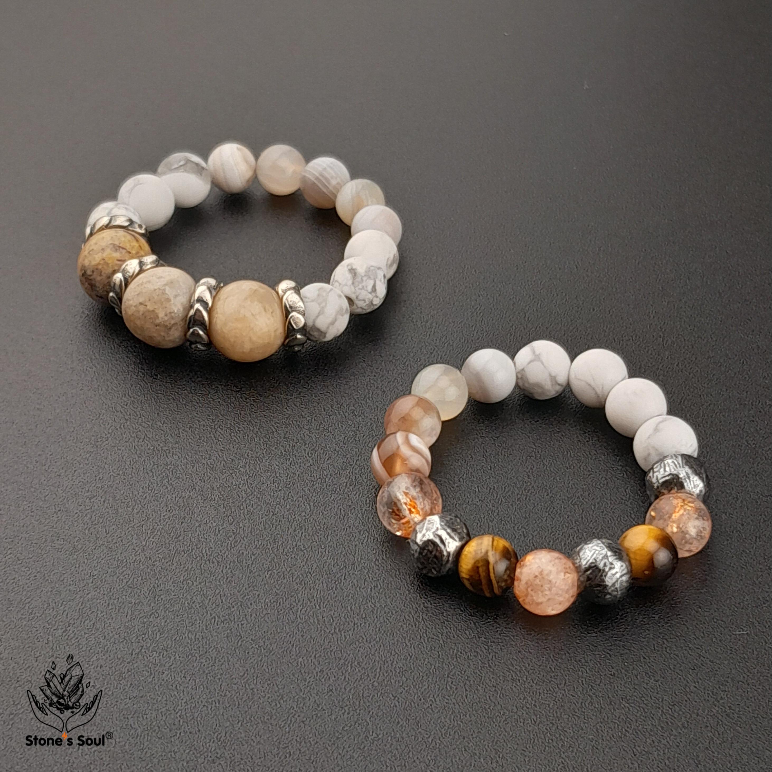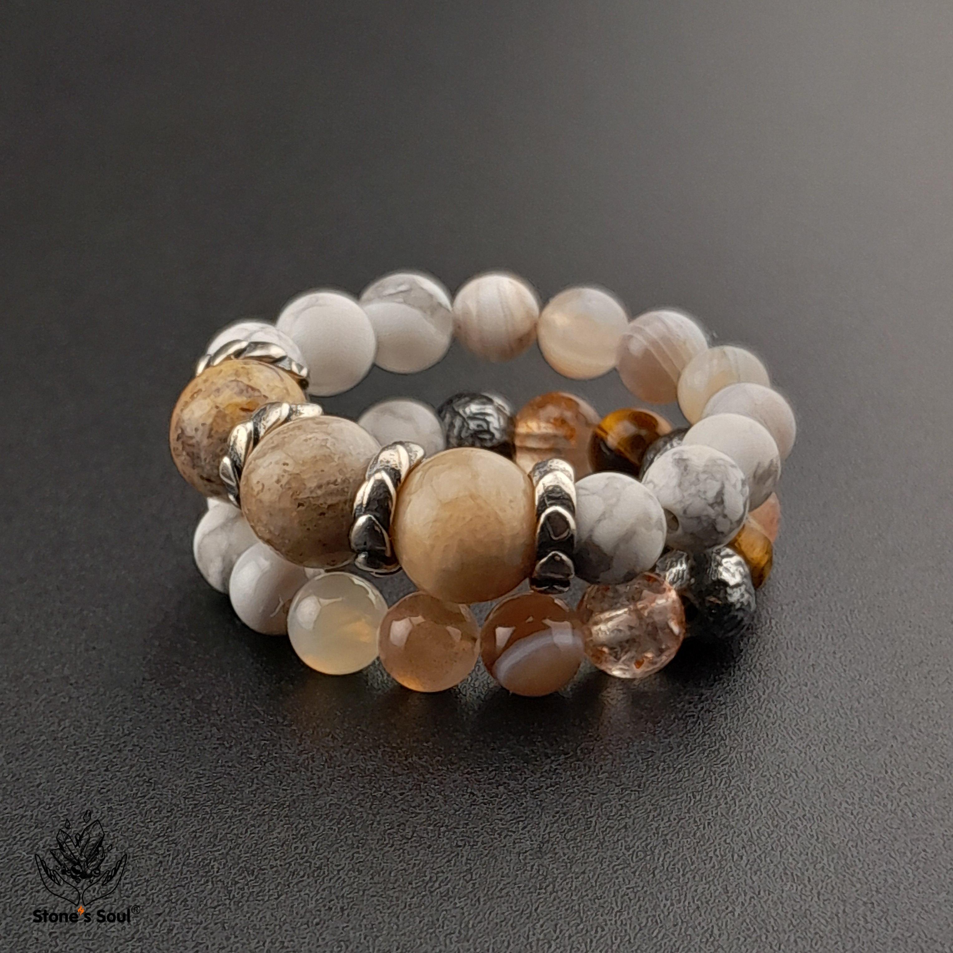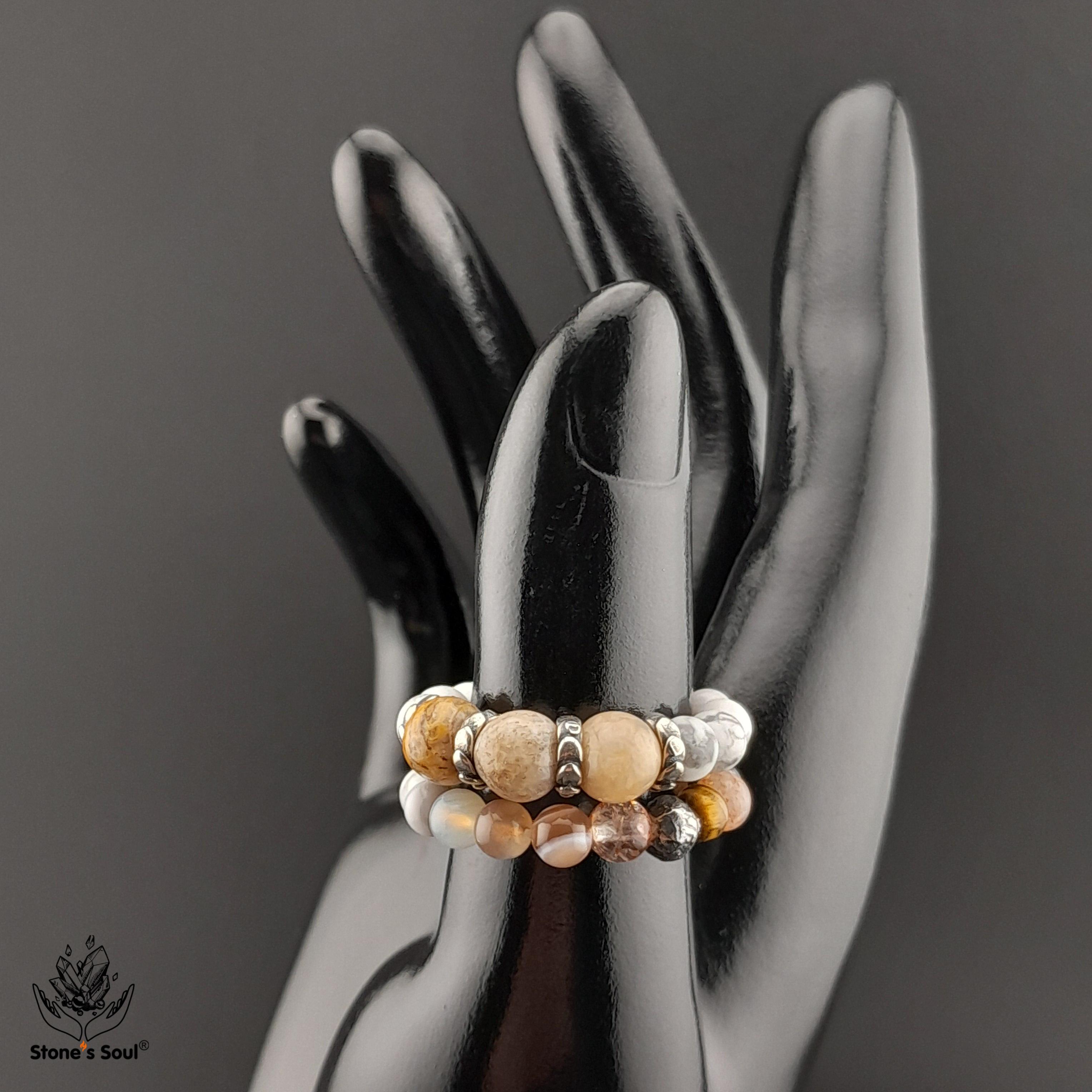 💎 Окаменелый коралл, Солнечный камень, Тигровый глаз, Агат Ботсвана, Говлит ⚜ комплект из 2х колечек 📿 Бусины 4-6мм ⚜ Фурнитура латунь с серебрением, серебро 📍 Арт. 6000103